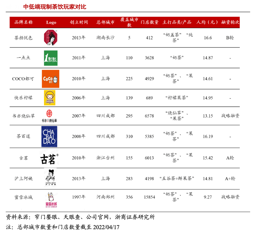 經(jīng)典案例:根據(jù)窄門餐眼、天眼查、公司官網(wǎng)、浙商證券研究所等綜合資訊表明,結(jié)合灼識咨詢資訊,2020年低端/中端茶飲占比約為 32%/49%,中低端合計(jì)占比約81%,同時(shí)根據(jù)奈雪的茶招股書,2020 年零售額市占率排名前五的中低端茶飲品牌分別是蜜雪冰城、CoCo都可、書亦燒仙草、古茗和一點(diǎn)點(diǎn),CR2 約為 24.9%,CR5 約為51.2%,低端茶飲市場集中度偏低,且不斷有新品牌涌現(xiàn),尚未跑出絕對龍頭,高端品牌正嘗試通過價(jià)格帶下沉搶占市場。