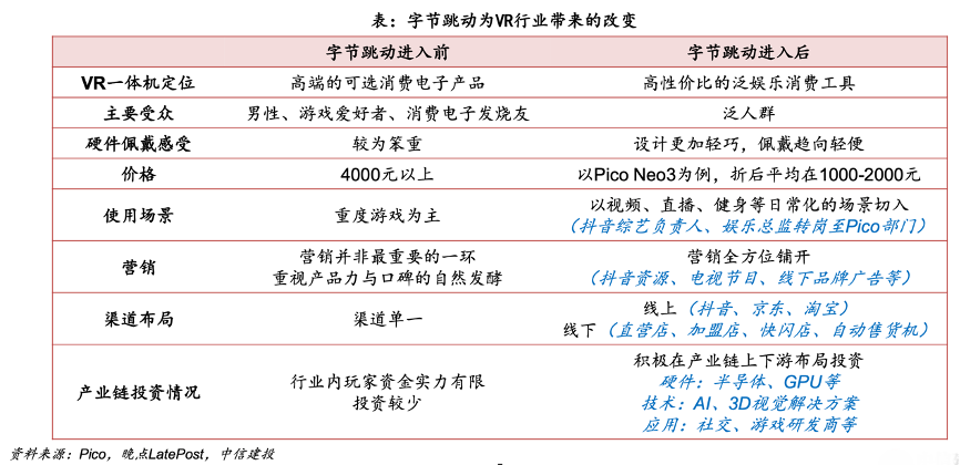 經(jīng)典案例:根據(jù)Pico、晚點(diǎn)LatePost、中信建投等綜合資訊表明,字節(jié)跳動(dòng)進(jìn)入VR行業(yè)后,定位、受眾、營(yíng)銷(xiāo)、渠道等均發(fā)生明顯的變化。