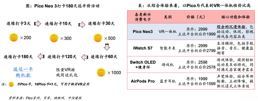 經(jīng)典案例:根據(jù)Pico官網(wǎng)、京東、映維網(wǎng)、中信建投等綜合資訊表明,字節(jié)Pico推出各類(lèi)折扣活動(dòng)促進(jìn)購(gòu)買(mǎi),如用戶(hù)使用Neo3內(nèi)相關(guān)內(nèi)容達(dá)到運(yùn)動(dòng)時(shí)長(zhǎng)30分鐘以上并打卡,至高可獲得一半購(gòu)機(jī)款返還,據(jù)Pico成功完成打卡活動(dòng)的用戶(hù)比例高達(dá)52%。