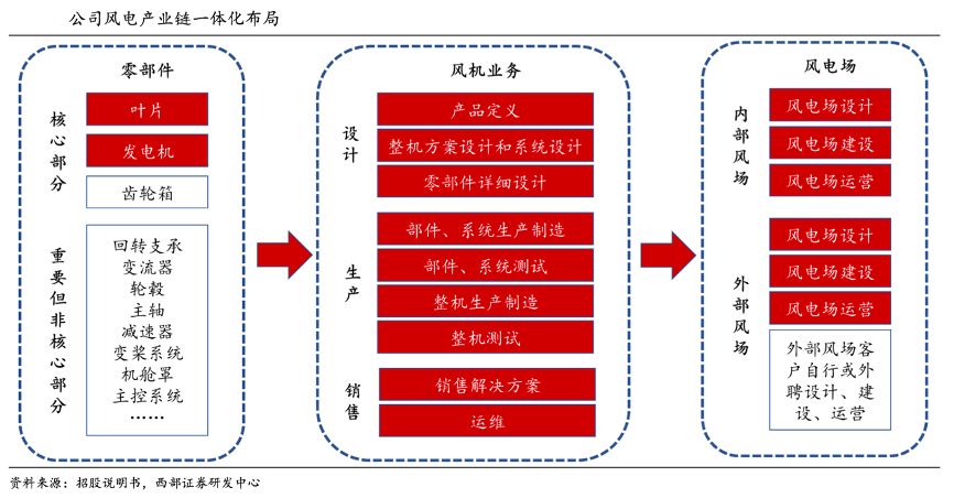 經(jīng)典案例:根據(jù)招股說(shuō)明書、西部證券研發(fā)中心等綜合資訊表明,三一重能公司在風(fēng)機(jī)核心零部件、風(fēng)機(jī)產(chǎn)品及運(yùn)維服務(wù)、風(fēng)電場(chǎng)設(shè)計(jì)、建設(shè)、運(yùn)營(yíng)等方面全方位布局,具備較強(qiáng)的產(chǎn)業(yè)鏈一體化能力。核心零部件方面,公司具備獨(dú)立研發(fā)生產(chǎn)制造風(fēng)機(jī)葉片、發(fā)電機(jī)的能力,并具備部分其他核心零部件的設(shè)計(jì)能力,同時(shí)結(jié)合智慧風(fēng)場(chǎng)、智慧運(yùn)維等技術(shù),為客戶提供高效運(yùn)維服務(wù),有效提升風(fēng)電場(chǎng)綜合利用小時(shí)數(shù),降低度電成本。