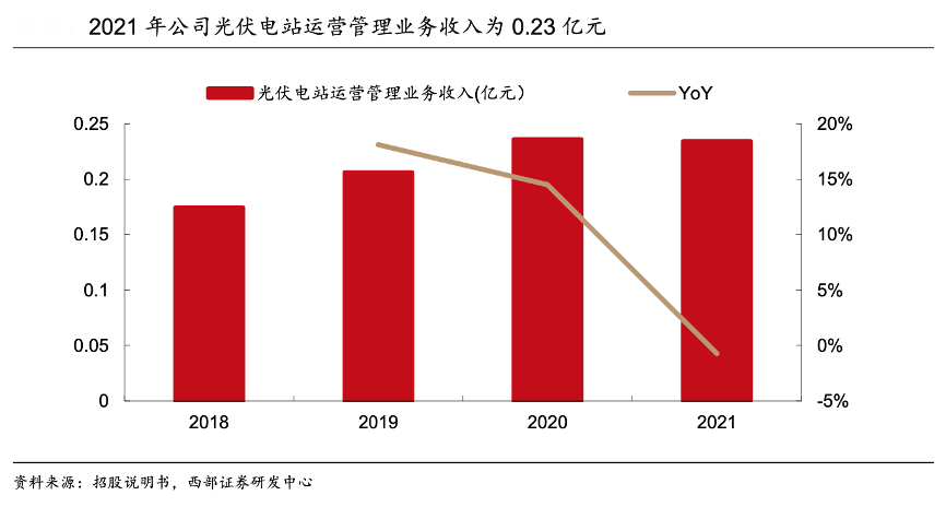 經(jīng)典案例:根據(jù)招股說(shuō)明書、西部證券研發(fā)中心等綜合資訊表明,三一重能公司旗下光伏電站運(yùn)營(yíng)業(yè)務(wù)主要由全資子公司三一太陽(yáng)能負(fù)責(zé),主要運(yùn)營(yíng)小規(guī)模分布式光伏電站,公司將所發(fā)電力自用或?qū)ν怃N售實(shí)現(xiàn)收入。2018-2021 年,公司光伏電站運(yùn)營(yíng)管理業(yè)務(wù)收入分別為 0.17/0.21/0.24/0.23 億元,同比+18.12%/+14.51%/-0.73%,CAGR 為 10.32%,占公司主營(yíng)業(yè)務(wù)收入比例分別為 1.89%/1.53%/0.26%/0.23%。