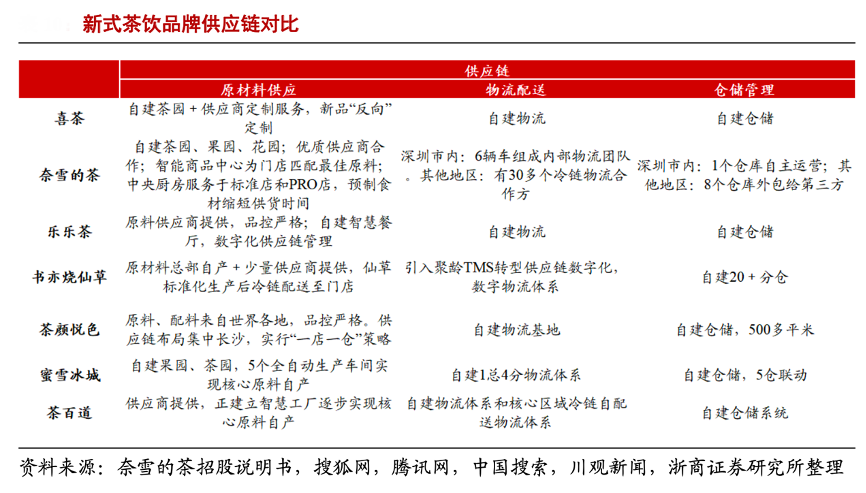 經(jīng)典案例:根據(jù)奈雪的茶招股說明書、搜狐網(wǎng)、騰訊網(wǎng)、中國(guó)搜索、川觀新聞、浙商證券研究所等綜合資訊表明,新茶飲品牌們正致力于構(gòu)建標(biāo)準(zhǔn)化的供應(yīng)鏈和產(chǎn)品制作體系來優(yōu)化提升產(chǎn)品品質(zhì)和運(yùn)營(yíng)效率,以奈雪的茶為例,根據(jù)《“數(shù)字化進(jìn)階”—2020新式茶飲白皮書》及奈雪的茶招股書,公司自建茶園、果園、花園來實(shí)現(xiàn)食材的一 致性,同時(shí)降低原材料成本;配置中央廚房,從而免去大部分門店的大面積后廚,降低租金成本同時(shí)實(shí)現(xiàn)了烘焙產(chǎn)品的規(guī)模化生產(chǎn)。