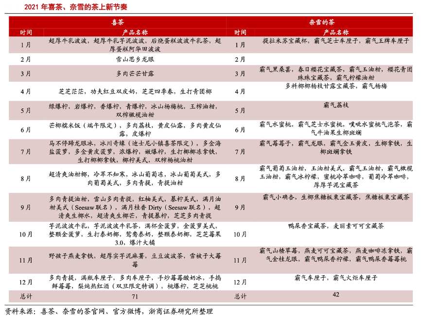 經(jīng)典案例:根據(jù)奈雪的茶官網(wǎng)、喜茶、官方微博、浙商證券研究所等綜合資訊表明,結(jié)合奈雪的茶和喜茶官方微博、微信公眾號(hào)數(shù)據(jù)不完全統(tǒng)計(jì)上新飲品數(shù)量(喜茶 2021 年總計(jì)約 71 款, 奈雪的茶總計(jì)約 42 款),以全年 52 周除以上新數(shù)量估計(jì)得,2021年喜茶平均 0.7 周上新一款飲品,奈雪為 1.2 周。根據(jù)喜茶發(fā)布的《2021 年靈感飲茶報(bào)告》,四款爆檸茶上新當(dāng)天(2021 年 5 月 11 日)賣出近 40 萬(wàn)杯,成為引領(lǐng)消費(fèi)潮流的出圈爆品,喜茶因此進(jìn)一步加大了品牌知名度,搶占消費(fèi)者心智。