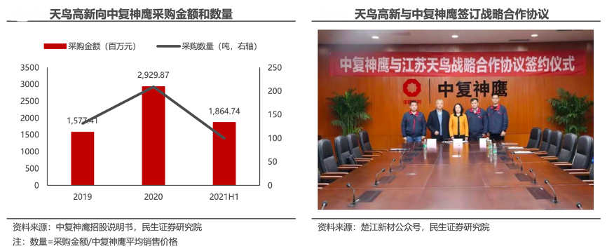 經(jīng)典案例:根據(jù)中復(fù)神鷹招股說明書、楚江新材公眾號、民生證券研究院等綜合資訊表明,天鳥高新為中復(fù)神鷹前五大客戶之一,2020年公司采購金額為 2,929.87 萬元,天鳥高新目前每年約采購碳纖維 400 噸,中復(fù)神鷹便可保障公司近一半的原材料。2022 年 1 月,公司與中復(fù)神鷹簽署了戰(zhàn)略合作備忘錄,將在航空航天、光伏能源等領(lǐng)域展開深入合作,實現(xiàn)了與優(yōu)質(zhì)碳纖維生產(chǎn)企業(yè)的深度綁定。