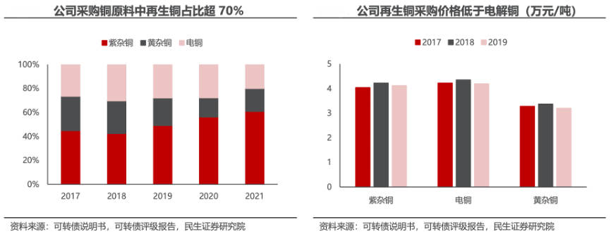 經(jīng)典案例:根據(jù)可轉(zhuǎn)債說明書、可轉(zhuǎn)債評級報告、民生證券研究院等綜合資訊表明,楚江新材公司每年采購的銅原料中,黃雜銅和紫雜銅 兩類再生銅原料數(shù)量占比超過70%,再生銅采購價格明顯低于電解銅價格,因此公司通過高再生銅使用比例有效降低了原材料成本,鑄就了公司的成本優(yōu)勢。以銅板帶為例,由于公司具備成本優(yōu)勢,公司銅板帶的毛利率水平位于行業(yè)前列。