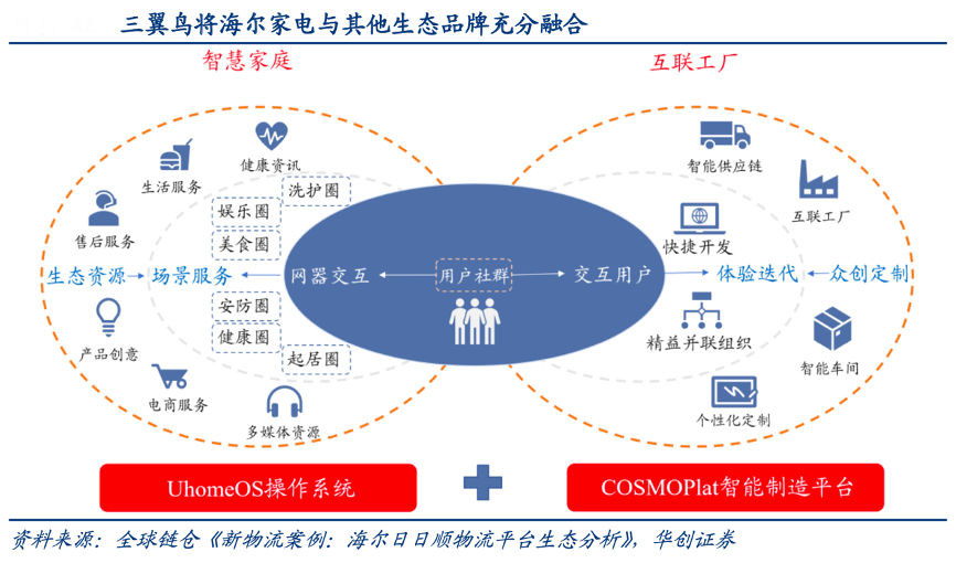 經(jīng)典案例:根據(jù)全球鏈倉《新物流案例:海爾日日順物流平臺生態(tài)分析》、華創(chuàng)證券等綜合資訊表明,三翼鳥生態(tài)以海爾家電為基礎(chǔ)不斷延伸拓展,借助卡奧斯平臺賦能提高生產(chǎn)供應(yīng)商效率,UhomeOS系統(tǒng)為智慧家庭提供操作接口,高端品牌卡薩帝提供套系產(chǎn)品,最終通過日日順物流的高效送裝實現(xiàn)場景生態(tài)落地。