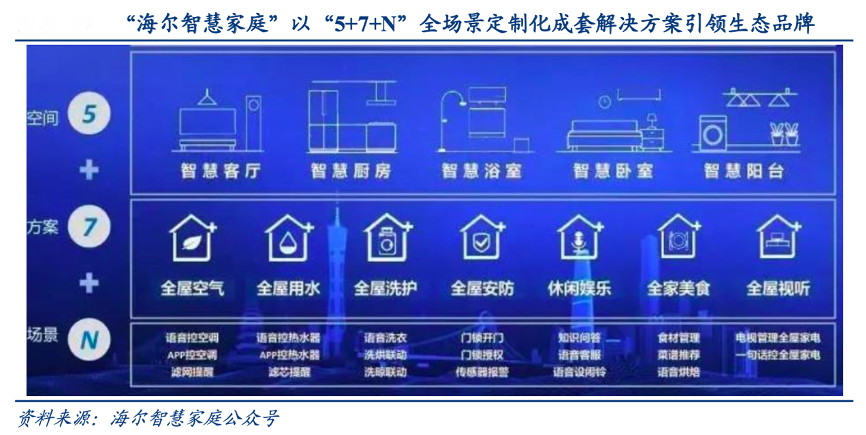 經(jīng)典案例:根據(jù)海爾智慧家庭公眾號、華創(chuàng)證券等綜合資訊表明,卡薩帝積極推動高端套系產(chǎn)品融入三翼鳥家居生態(tài)戰(zhàn)略,以場景替代產(chǎn)品,對應(yīng)推出不同的高端智慧成套方案,并配合海爾主品牌產(chǎn)品,涵蓋智慧客廳、智慧廚房、智慧臥室等 5 大生活場景,并配合用電用水等 7 大全屋解決方案,對 N 個生活場景個性化運用。例如廚房場景中卡薩帝冰箱除了能讓食材控氧保鮮外,還能通過分析食材數(shù)據(jù)推薦菜單,而根據(jù)菜譜灶具可以智能控火,無需人為照看。