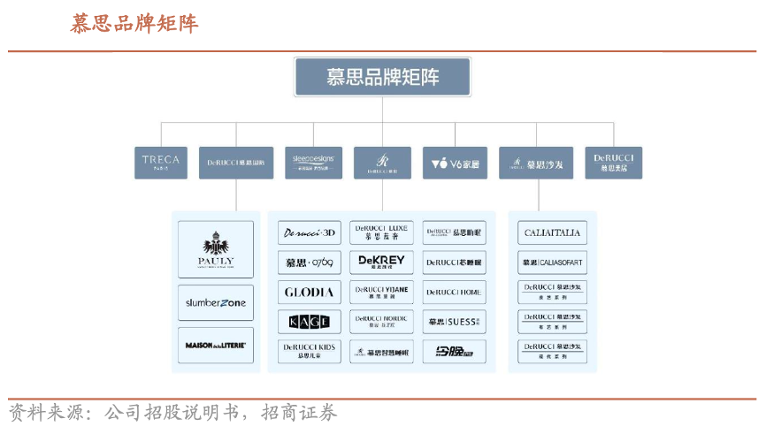 經(jīng)典案例:根據(jù)公司招股說明書、招商證券等綜合資訊表明,“慕思”已成為我國床墊行業(yè)的知名品牌,其目前已形成 7 大主力品牌,包括“慕思”、 “V6 家居”、“崔佧(TRECA)”、“慕思國際”、“思麗德賽(Sleep Designs)”、“慕思沙發(fā)”和“慕思美居”,構(gòu)建了完整的中高端及年輕時尚品牌矩陣,可滿足消費者定制化的健康睡眠需求。