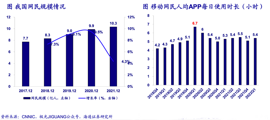 經典案例:根據CNNIC、極光JIGUANG公眾號、海通證券研究所等綜合資訊表明,截至2021年12月底,我國網民數量達10.3億,根據極光大數據,22Q1中國移動網民人均APP每日使用時長穩(wěn)定于5.4小時,移動互聯網已經進入存量競爭時代。