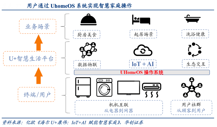 經(jīng)典案例:根據(jù)億歐《海爾U+康偉:IOT+AI賦能智慧家庭》、華創(chuàng)證券等綜合資訊表明,UhomeOS發(fā)布于2016 年,是海爾專(zhuān)為智慧家庭定制的生態(tài)操作系統(tǒng),涵蓋臥室起居、廚房美食、浴室洗護(hù)等多個(gè)場(chǎng)景,可以通過(guò) UhomeOS 系統(tǒng)把用戶(hù)、家電、服務(wù)三者串聯(lián)起來(lái),提供全屋智能落地方案。