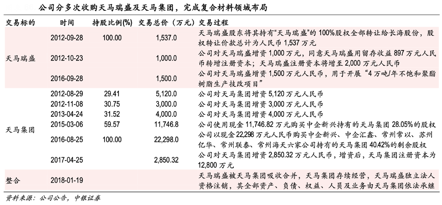 經(jīng)典案例:根據(jù)公司公告、中銀證券等綜合資訊表明,長海股份公司從 2012 年開始 至 2016 年,分多次收購天馬集團及天馬瑞盛,并于 2018 年將兩家子公司進行整合。公司通過天馬集 團開展化工業(yè)務(wù),主要產(chǎn)品為不飽和聚酯樹脂,具體產(chǎn)品還包括玻纖粘結(jié)劑、羥酯、顏料糊、固化劑、乙烯基酯樹脂等。天馬集團生產(chǎn)的化工制品是公司各類玻纖制品的重要原料,由此,公司已形成“玻纖紗—玻纖制品—樹脂—復(fù)合材料”的完整產(chǎn)業(yè)鏈布局。