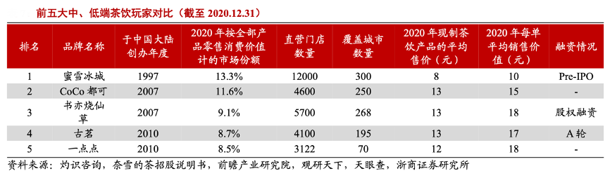 經(jīng)典案例:根據(jù)灼識咨詢、奈雪的茶招股說明書、前瞻產(chǎn)業(yè)研究院、觀研天下、天眼查、浙商證券研究所等綜合資訊表明,結(jié)合奈雪的茶招股書,2020 年零售額市占率排名前五的中低端茶飲品牌分別是蜜雪冰城、CoCo都可、書亦燒仙草、古茗和一點(diǎn)點(diǎn),CR2約為24.9%,CR5 約為51.2%,低端茶飲市場集中度偏低,且不斷有新品牌涌現(xiàn),尚未跑出絕對龍頭,高端品牌正嘗試通過價格帶下沉搶占市場。