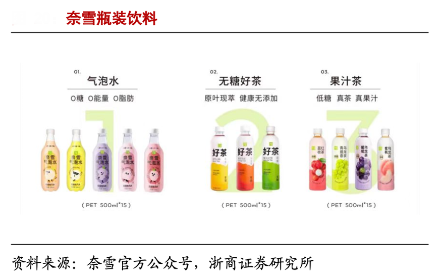 經(jīng)典案例:根據(jù)奈雪官方公眾號、浙商證券研究所等綜合資訊表明,相比傳統(tǒng) RTD 品牌,現(xiàn)制飲料品牌通過線下單個或部分門店試銷產品,“研發(fā)-上新-反饋”周期更短、試錯成本更低,高頻高質上新讓現(xiàn)制茶飲線爆品頻出。2022年1月,奈雪推出葡萄烏龍茶和好茶等多款瓶裝飲料,積極入局零售市場,目前RTD產品主要有氣泡水、純茶和果汁茶三類。