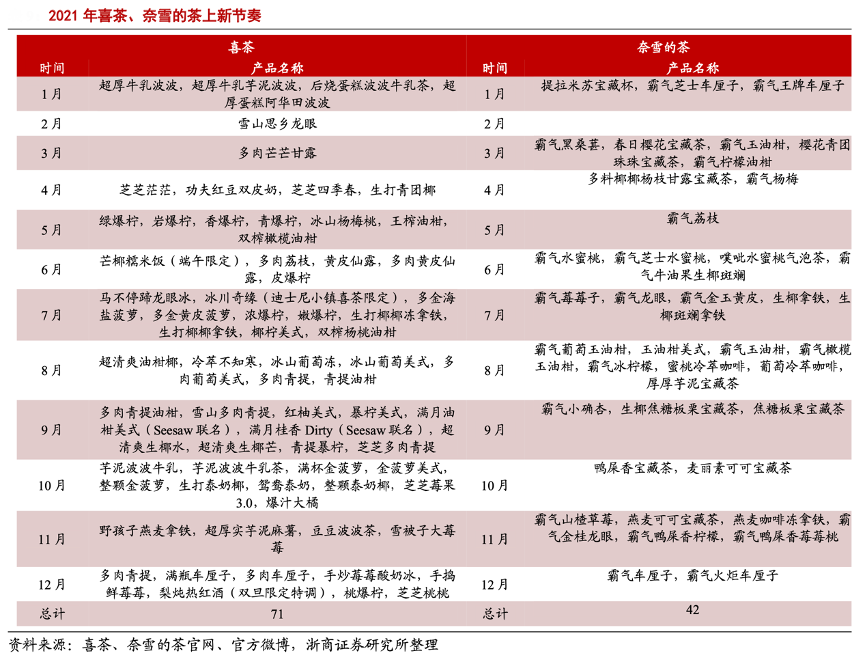 經(jīng)典案例:根據(jù)喜茶、奈雪的茶官網(wǎng)、官方微博、浙商證券研究所等綜合資訊表明,結合微信公眾號數(shù)據(jù)等不完全統(tǒng)計,上新飲品數(shù)量(喜茶 2021 年總計約 71 款,奈雪的茶總計約 42 款),根據(jù)喜茶發(fā)布的《2021年靈感飲茶報告》,四款爆檸茶上新當天(2021 年 5 月 11 日)賣出近 40 萬杯,成為引領消費潮流的出圈爆品,喜茶因此進一步加大了品牌知名度,搶占消費者心智。