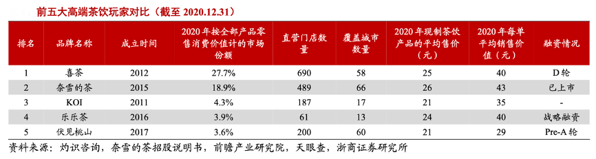 經(jīng)典案例:根據(jù)灼識(shí)咨詢、奈雪的茶招股說(shuō)明書(shū)、前瞻產(chǎn)業(yè)研究院、天眼查、浙商證券研究所等綜合資訊表明,從增速來(lái)看,根據(jù)艾瑞咨詢,高端現(xiàn)制茶飲店零售規(guī)模在 2015-2020 年復(fù)合增速為 75.8%,2020- 2025年預(yù)期復(fù)合增速為 32.2%,顯著高于中端和低端茶飲預(yù)期復(fù)合增速。從零售額占比來(lái)看,2020年中國(guó)高端現(xiàn)制茶飲零售額占中國(guó)整體現(xiàn)制茶飲的19.7%,而 2025 年,預(yù)計(jì)高端茶飲占比為 24.6%,高端現(xiàn)制茶飲份額有望持續(xù)提升。