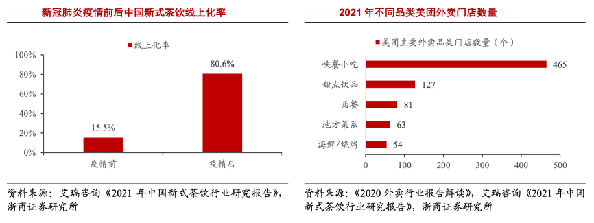 經(jīng)典案例:根據(jù)艾瑞咨詢《2021年中國(guó)新式茶飲行業(yè)研究報(bào)告》、《2020外賣行業(yè)報(bào)告解讀》、浙商證券研究所等綜合資訊表明,截至 2020 年,現(xiàn)制茶飲的外賣零售額占比約為 25.0%,且預(yù)期 2025 年現(xiàn)制茶飲的外賣 占比上升至 33.2%。同時(shí)根據(jù)《2021 年 美團(tuán)業(yè)務(wù)經(jīng)營(yíng)狀況與中國(guó)外賣行業(yè)研究報(bào)告》,疫情前/后中國(guó)現(xiàn)制茶飲線上化率分別為15.5%/80.6%。根據(jù)奈雪發(fā)布《2021 年大數(shù)據(jù)報(bào)告》,2021年奈雪線上點(diǎn)單占比超 7 成,線上訂單數(shù)相比 2020 年增加 64%。