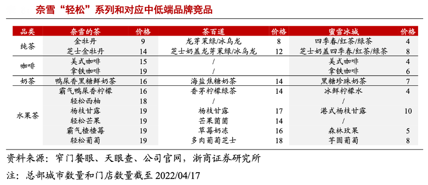 經(jīng)典案例:根據(jù)窄門餐眼、天眼查、公司官網(wǎng)、浙商證券研究所等綜合資訊表明,低端茶飲市場不斷有新品牌涌現(xiàn),尚未跑出絕對龍頭,高端品牌正嘗試通過價(jià)格帶下沉搶占市場。