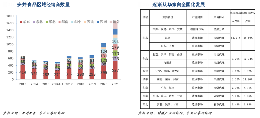 經(jīng)典案例:根據(jù)公司公告、前瞻產(chǎn)業(yè)研究院、東興證券研究所等綜合資訊表明,安井安井一直采取對(duì)經(jīng)銷商取貼身服務(wù)的模式,推動(dòng)經(jīng)銷商從坐商-行商-平臺(tái)商-終端商發(fā)展,培養(yǎng)了一批實(shí)力雄厚的經(jīng)銷商。目前安井品牌在大流通和 C 端的大單品品類中,已經(jīng)具有明顯的品牌號(hào)召力。