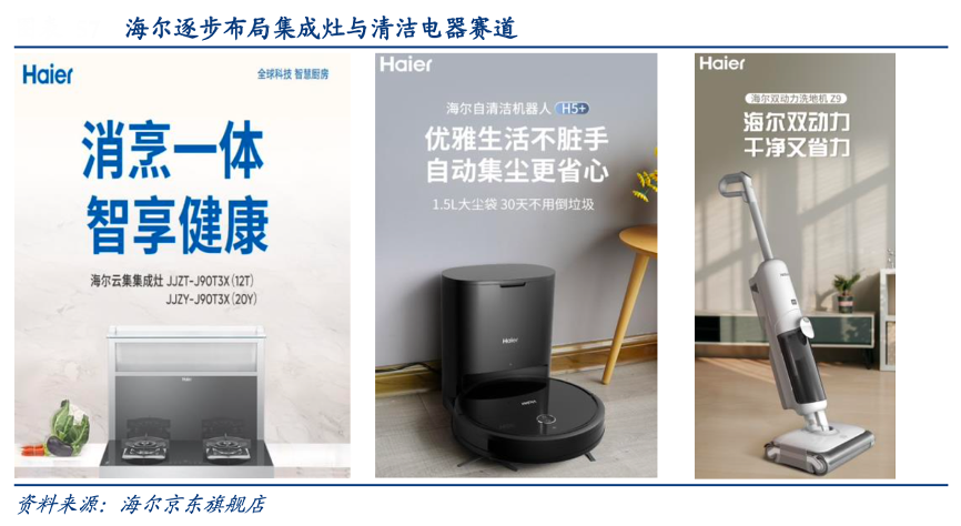 經(jīng)典案例:根據(jù)海爾京東旗艦店、華創(chuàng)證券等綜合資訊表明,2021年12月海爾成立智慧生活家電事業(yè)部,主要用于清潔電器、集成灶與智能家居等品類的研發(fā)推廣,對三翼鳥廚房、客廳等場景進(jìn)行產(chǎn)品補(bǔ)充。新興生活家電品類與強(qiáng)勢大家電的協(xié)同效應(yīng)不僅能夠完善強(qiáng)化海爾家電全品類的落地能力,同時(shí)也將推動(dòng)三翼鳥場景品牌的進(jìn)一步擴(kuò)張。