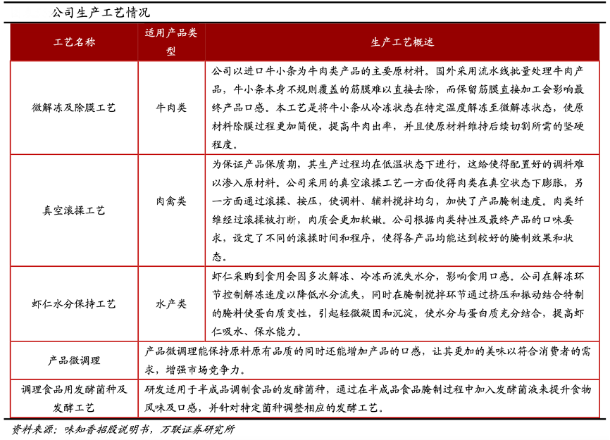 經(jīng)典案例:根據(jù)味知香招股說明書、萬聯(lián)證券研究所等綜合資訊表明,味知香公司從最終產(chǎn)品食用體驗出發(fā),結(jié)合原材料物理、生化特性和冷凍、解凍對產(chǎn)品的影響,有針對性地調(diào)整調(diào)料配比、改進(jìn)加工工藝,以滿足消費(fèi)者多樣化的飲食需求?,F(xiàn)有工藝有適用牛肉類的微解凍及除 膜工藝、適用肉禽類的真空滾揉工藝和適用水產(chǎn)類的蝦仁水分保持工藝,正在研發(fā)中的工藝有產(chǎn)品微調(diào)理工藝和調(diào)理食品用發(fā)酵菌種及發(fā)酵工藝。