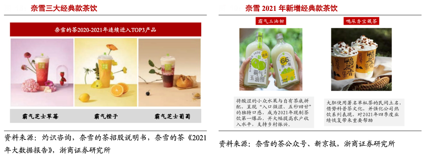 經(jīng)典案例:根據(jù)灼識(shí)咨詢、奈雪的茶招股說明書、奈雪的茶《2021年大數(shù)據(jù)報(bào)告》、奈雪的茶公眾號(hào)、新京報(bào)、浙商證券研究所等綜合資訊表明,按 2020 年的顧客訂單數(shù)量統(tǒng)計(jì),奈雪的茶三大暢銷經(jīng)典茶飲分別為霸氣芝士草莓、霸氣橙子和霸氣芝士葡萄,三大單品售出超 21.8 萬杯,合計(jì)貢獻(xiàn)現(xiàn)制茶飲銷 售額的 27.6%。其中 2020 年3 月面世的霸氣芝士葡萄在 2020 全年的訂單總數(shù)約 6.0 百萬 杯,貢獻(xiàn)現(xiàn)制茶飲銷售額的 7.6%。同時(shí)2021 年奈雪推出的油柑、鴨屎香寶系列爆款產(chǎn)品為例,基于穩(wěn)定的熱度和 較高的復(fù)購率,其已將其轉(zhuǎn)到經(jīng)典產(chǎn)品線,為奈雪持續(xù)成長(zhǎng)貢獻(xiàn)營(yíng)收。