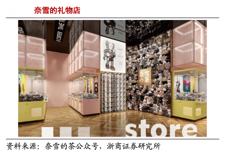 經(jīng)典案例:根據(jù)奈雪的茶公眾號(hào)、新京報(bào)、浙商證券研究所等綜合資訊表明,2018 年 12 月,奈雪的茶公司正式啟動(dòng)“奈雪的禮物”全國(guó)落地計(jì)劃,于廈門推出首家奈雪的禮物門店。奈雪的禮物門店配備了娃娃 機(jī)、奈雪的茶衍生產(chǎn)品抽獎(jiǎng)機(jī)及其他流行游戲設(shè)備。據(jù)奈雪的茶公眾號(hào),禮物店特設(shè)“禮物 store”專區(qū),在這里可以抓取到奈雪團(tuán)隊(duì)從全球各地尋到的限量潮玩、手辦以及與各品牌的聯(lián)名,奈雪以娛樂販賣的方式帶給顧客不一樣的體驗(yàn)。