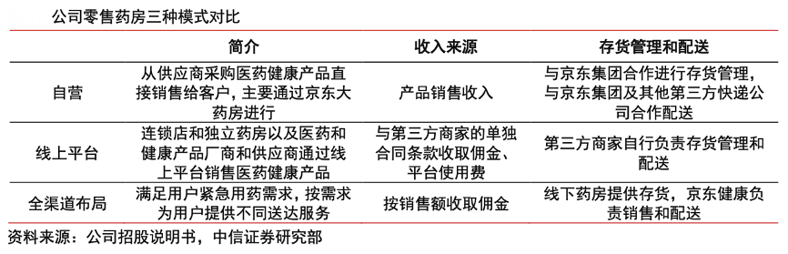 經(jīng)典案例:根據(jù)公司招股說(shuō)明書(shū)、中信證券研究部等綜合資訊表明,京東健康零售藥房提供包括處方藥、非處方藥(OTC)、醫(yī)療器械和耗材、保健滋補(bǔ)品等多類醫(yī)藥健康產(chǎn)品,SKU 數(shù)量已超 4000 萬(wàn)。公司零售藥房業(yè)務(wù)主要分為自營(yíng)、第三方平臺(tái)和全渠道布局三種模式,打造了“B2C+O2O”和“自營(yíng)+平臺(tái)”的復(fù)雜組合能力圈。