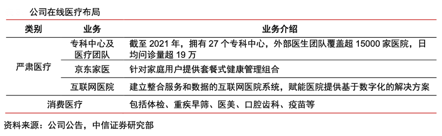 經(jīng)典案例:根據(jù)公司公告、中信證券研究部等綜合資訊表明,京東健康公司建立了由嚴(yán)肅醫(yī)療、家庭健康管理和消費(fèi)醫(yī)療組成的醫(yī)療健康服務(wù)生態(tài),不斷提 升線上線下一體化服務(wù)能力。