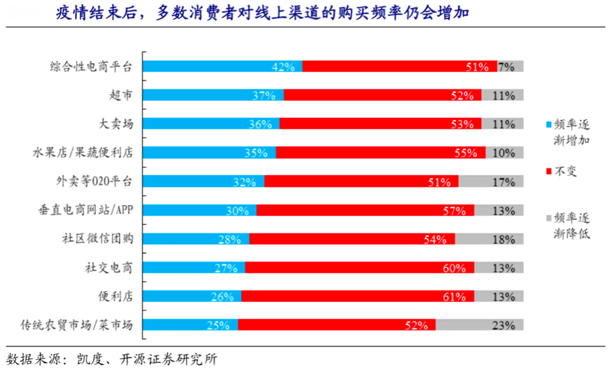 便利性生活消費持續(xù)增長,消費者對網(wǎng)絡(luò)生鮮消費、便利消費等常規(guī)線下生活消費的“線上下單接受度”日益提升。根據(jù)凱度、開源證券研究所等綜合資訊表明,疫情結(jié)束后,消費者將逐漸恢復(fù)在線下渠道的購買頻率,分別有 35% 以上的消費者會更加頻繁地去超市/大賣場,而線上渠道的使用頻率預(yù)計仍會強勁增長,42%的消費者會增加綜合性電商平臺使用次數(shù),只有7%的人預(yù)計會減少。同時, 外賣等 O2O 平臺以及社區(qū)微信團購的使用頻率也將有望持續(xù)增長。