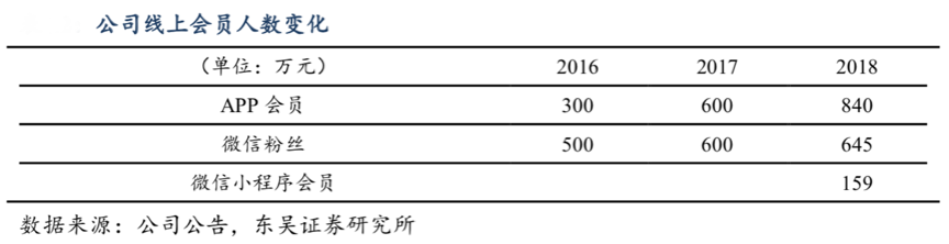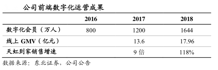 經(jīng)典案例:據(jù)公司公告、東北證券研究所等綜合資訊表明,目前天虹在線上的銷(xiāo)售渠道包括獨(dú)立APP、微信公眾號(hào)、微信小程序、PC、微品等多個(gè)渠道,且會(huì)員均全部打通。截至 2018 年底,天虹整體會(huì)員人數(shù) 1800 萬(wàn)、數(shù)字化會(huì)員人數(shù)達(dá) 1,644 萬(wàn),其中 APP 會(huì)員人數(shù) 840 萬(wàn),微信粉絲 645 萬(wàn),微信小程序會(huì)員 159 萬(wàn),消費(fèi)活躍用戶數(shù)占比 87%。2018 年公司的線上交易額達(dá)到 18 億,同增 32%