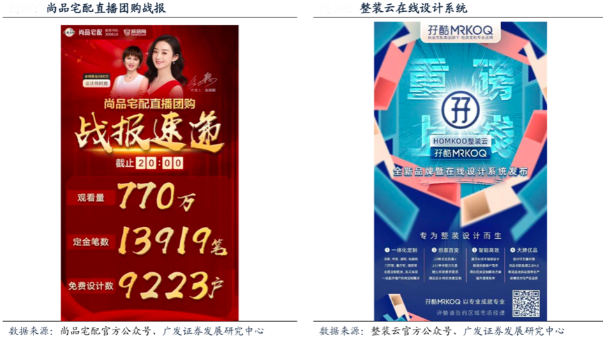 經(jīng)典案例:據(jù)品牌官方公眾號及廣發(fā)證券發(fā)展研究中心等綜合資訊顯示,尚品宅配攜手擁有3000萬粉絲的“設(shè)計師阿爽”在各直播平臺開啟直播團(tuán)購,5小時的直播時間里共有770萬人觀看,成交訂單1.39萬筆,實(shí)現(xiàn)9223筆設(shè)計預(yù)約;其整裝云推出“孖酷MRKOQ”在線設(shè)計系統(tǒng),為會員企業(yè)解決在線設(shè)計問題。