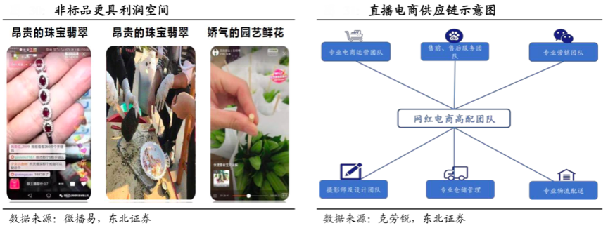 直接電商是前端,強(qiáng)大“供應(yīng)鏈系統(tǒng)”是重要支撐。“起勢靠流量,成敗看供應(yīng)鏈”,完善的直播電商需要“專業(yè)供應(yīng)鏈支持”。精選商品,退換貨管理、柔性供應(yīng)鏈能力、倉儲物流管理等才是增加用戶滿意度,提升轉(zhuǎn)化率和復(fù)購率的核心。標(biāo)準(zhǔn)品以“規(guī)模化生產(chǎn)分銷”為導(dǎo)向,側(cè)重“以量取勝”,而非標(biāo)品則以“價值化行銷”為導(dǎo)向,側(cè)重“以質(zhì)取勝”,鎖定高品質(zhì)消費人群做“圈子營銷”。根據(jù)微播易、東北證券 、克勞銳等綜合資訊表明,非標(biāo)品更具利潤空間,直播電商供應(yīng)鏈價值突出。