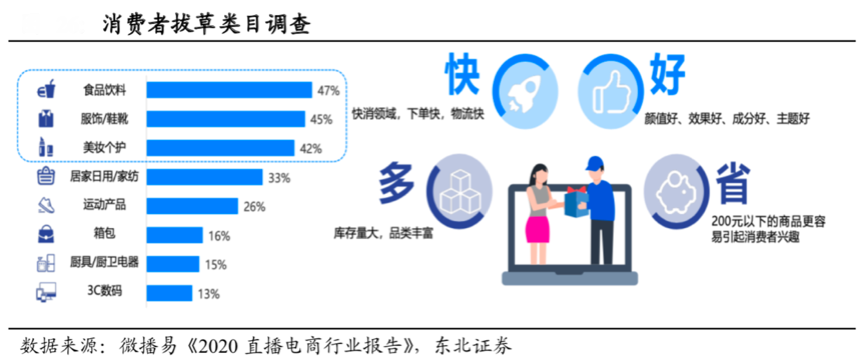 直播電商近兩年內(nèi)剛剛興起,其有自己的適合品類及適配人群,基于品類特質(zhì)做“直播商品篩選”,強(qiáng)化產(chǎn)品的高效組合,是直播電商新零售競爭取勝的“不二法則”。根據(jù)微播易、東北證券等綜合資訊表明,當(dāng)前消費者在直播電商中的購物興趣主要集中在快消品上,以食品飲料、服裝、美妝個護(hù)等品類為主,核心追求直播電商帶來的性價比。淘寶直播、抖音、快手等主 要電商直播平臺帶貨類目除淘寶擁有如珠寶等基于平臺信用價值、場景價值的客單 類目外,抖音和快手主要品類主要還是集中在性價比高的實用型產(chǎn)品,客單價分為在 0-50 元和 0-200 元區(qū)間。