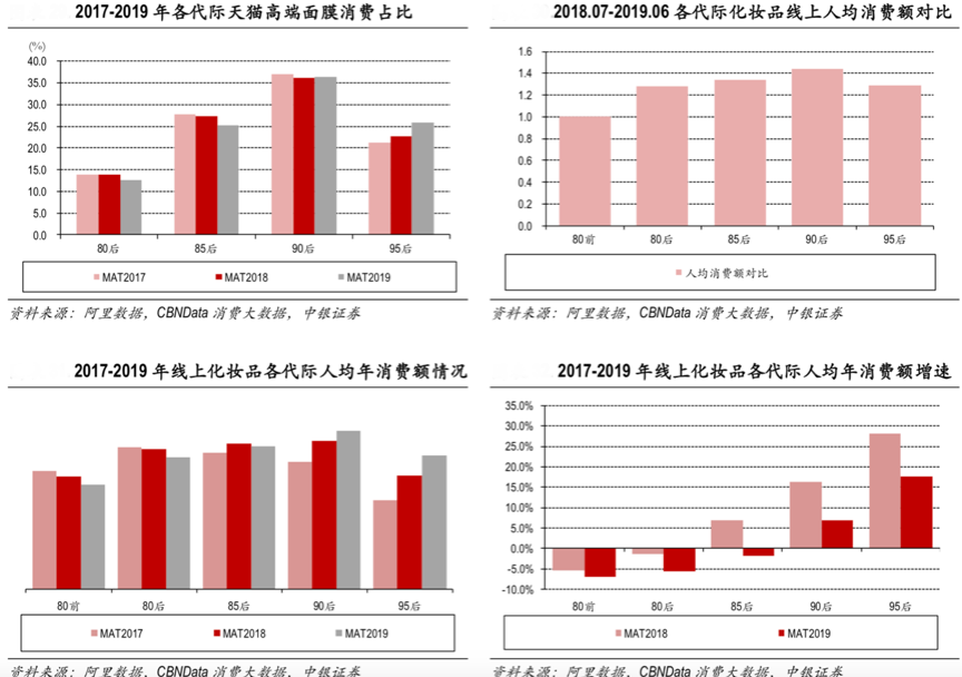 美妝代際消費(fèi)升級(jí)不可避免,中高端美妝消費(fèi)提升。據(jù)中銀證券等綜合資訊顯示,據(jù)阿里數(shù)據(jù)及 CBNData 消費(fèi)大數(shù)據(jù)顯示,MAT2017-MAT2019,天貓高端面膜消費(fèi)中,僅 95 后消費(fèi)占比持續(xù)提升,最終超越 85 后位列第二,僅次于 90 后;線上化 妝品人均消費(fèi)額方面,95 后增速領(lǐng)先明顯,最終從末位躍居第三,僅次于 90 后、85 后。