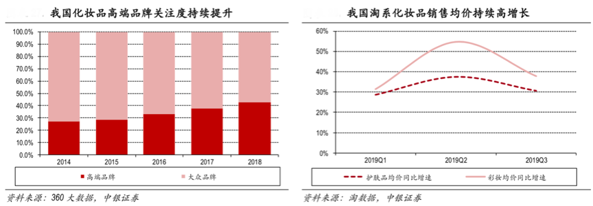 化妝品行業(yè)多年前已經(jīng)進(jìn)入了“品牌競(jìng)爭(zhēng)時(shí)代”,品牌價(jià)值引領(lǐng)著用戶化妝品消費(fèi),品牌形象搶占著用戶消費(fèi)心智,中高端產(chǎn)品更引領(lǐng)著國內(nèi)化妝品消費(fèi)的升級(jí)。據(jù)360大數(shù)據(jù)及中銀證券等綜合資訊顯示,2014-2018 年,我國消費(fèi)者對(duì)化妝品高端品牌的關(guān)注度持續(xù)提升,2018年已超 40%。據(jù)淘數(shù)據(jù)顯示,2019Q1-Q3,我國淘系化妝品銷售均價(jià)同比增速基本維持在 30%以上,剔除部分漲價(jià) 因素影響,更多源自消費(fèi)檔次提升帶來的消費(fèi)結(jié)構(gòu)改善。
