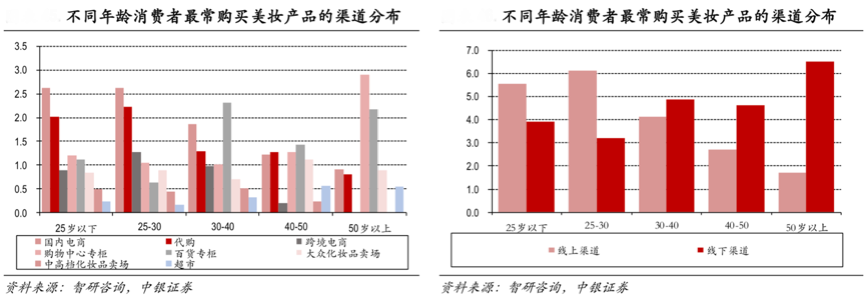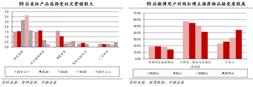 95后已經(jīng)成為國內(nèi)化妝品消費(fèi)的主力人群,化妝品代際消費(fèi)替換中。據(jù)中銀證券等綜合資訊顯示,從年齡分布上看,95年后出生的 Z 世代逐漸成為消費(fèi)主 力,其美妝意識(shí)形成較早,對(duì)化妝品的品質(zhì)訴求較強(qiáng),是化妝品消費(fèi)最大潛力群體。根據(jù)阿里數(shù)據(jù)分析,95后在線上人均化妝品消費(fèi)增速2018-2019年都是各代際里最高的,也是線上增速貢獻(xiàn)最大的群體。