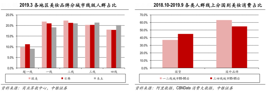 同時(shí),“區(qū)域市場(chǎng)下沉”對(duì)于國內(nèi)化妝品智慧零售模式策劃來說是重要的戰(zhàn)略性機(jī)遇。據(jù)中銀證券等綜合資訊顯示,分城市線級(jí)來看,據(jù)商業(yè)算數(shù)中心數(shù)據(jù)顯示,2019 年 3 月美妝品牌消費(fèi)人群中,僅三四線城市國產(chǎn) 品牌消費(fèi)占比高于海外品牌。另有數(shù)據(jù)顯示,85-95 后國產(chǎn)品牌美妝消費(fèi)中,三四線城市占比明顯高 于一二線城市,可見三四線城市是國產(chǎn)品牌的優(yōu)勢(shì)市場(chǎng)。
