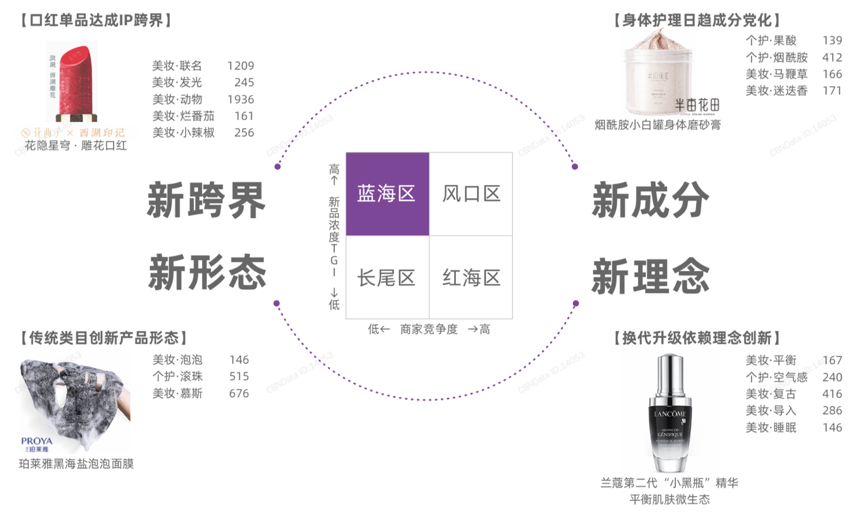 創(chuàng)新的維度是多種多樣的,對于美妝洗護(hù)品類來說,尤其如此。根據(jù)阿里媽媽、天貓發(fā)布alimama insight《后風(fēng)險時代的中的紅海突圍與藍(lán)海發(fā)掘》等綜合資訊表明,新成分、新跨界、新形態(tài)、新理念四個維度探索有效的需求創(chuàng)新溝通點(diǎn)。