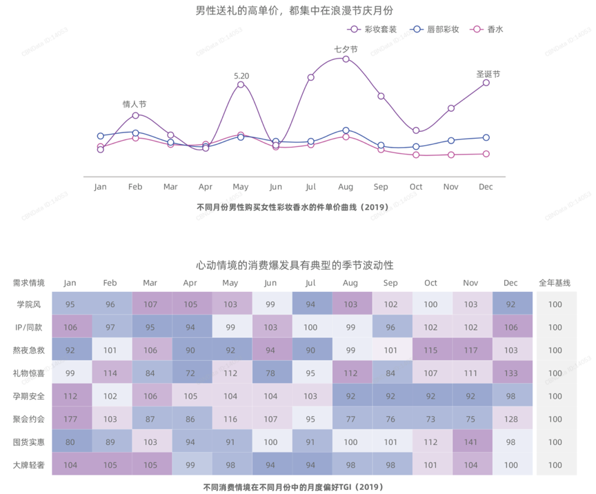 美妝洗護(hù)消費(fèi)屬于“情境式消費(fèi)”,是“沖動式消費(fèi)”,優(yōu)秀的品牌總能點(diǎn)亮原點(diǎn)人群的“心動情境”。根據(jù)阿里媽媽、天貓發(fā)布alimama insight《后風(fēng)險時代的中的紅海突圍與藍(lán)海發(fā)掘》等綜合資訊表明,所謂消費(fèi)的心動情境是指人們在日常消費(fèi)中,往往會有一些時點(diǎn)/場景能夠讓人的購買欲得到極大激發(fā)。關(guān)注不同需求情境的爆發(fā)節(jié)奏,刷新美妝品牌的“消費(fèi)訴求”,配合制定年度營銷時間線;學(xué)院風(fēng)集中于開季前后;禮物驚喜爆發(fā)于浪漫節(jié)點(diǎn);孕期安全集中于上半年;聚會約會則集中在年末節(jié)慶季。