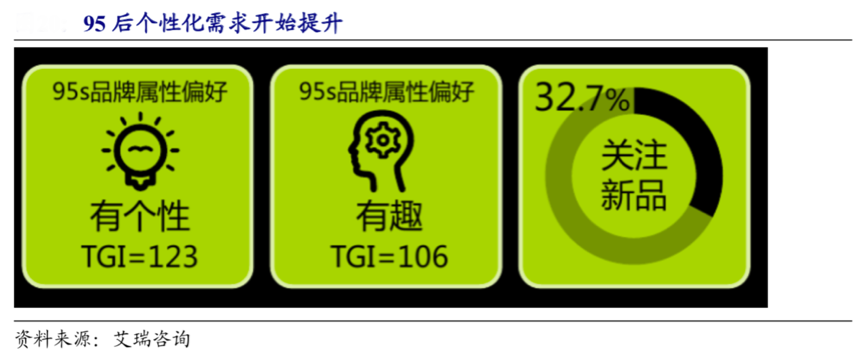 小家電的消費場景大多集中在家庭、辦公等相對私密化空間,激發(fā)情感共鳴、塑造品牌IP形象才能激發(fā)小家電消費者的消費熱情。根據(jù)艾瑞咨詢在《種草一 代:95 后時尚消費報告》中的調(diào)研數(shù)據(jù),個性、有趣已經(jīng)成為其最重要的品牌訴求, TGI 分別達到 123 和 106。(TGI:目標(biāo)年齡段統(tǒng)一該觀點的人群占比/其他年齡段同 意該觀點的人群占比*100)大眾化的審美已不再受到重視,有樂趣、有個性、有創(chuàng)新的產(chǎn)品才會更受歡迎。