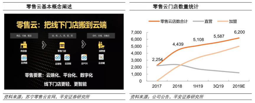 經(jīng)典案例:根據(jù)公司公告、蘇寧零售云官網(wǎng)、平安證券研究所等綜合資訊表明,蘇寧的新業(yè)態(tài)“零售云”,其在下沉市場開設(shè)面積僅為數(shù)百平米的小型店鋪,或邀請當(dāng)?shù)匦⌒偷膯误w或連鎖家電、手機店加盟,將下沉市場零散的零售模式進行云端化、平臺化&數(shù)字化改造。蘇寧為各零售云店提供貨源、物流&售后、銷售培訓(xùn)、金融服務(wù)、數(shù)據(jù)管理系統(tǒng)等一系列支持。截止 3Q19,蘇寧零售云門店數(shù)已超 5,587 家,其中直營店近 1,500 家,加盟店超4,000 家,“加盟店”是蘇寧搶占下沉市場最有效的工具。