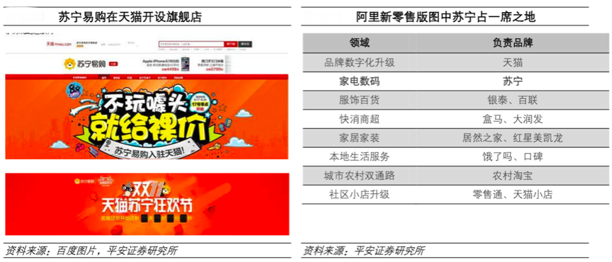 經(jīng)典案例:根據(jù)百度圖片、平安證券研究所等綜合資訊表明,蘇寧與阿里換股后雙方就重磅新品首發(fā)、線上線下數(shù)據(jù)打通、新零售及門店改造等方面合作突進,雙方整合了線上流量, 并通過大數(shù)據(jù)提升了門店獲客及轉(zhuǎn)化效率,同時也為蘇寧拿下大潤發(fā)家電 3C 區(qū)的合作打下了基礎(chǔ)。