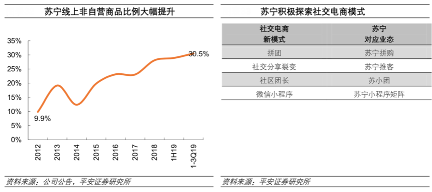 經(jīng)典案例:根據(jù)公司公告、平安證券研究所等綜合資訊表明,至2019年前三季度,蘇寧線上非自營商品比例已超30%,其更先后成立蘇寧拼購、蘇寧推客、蘇小團、小程序矩陣等新型線上業(yè)態(tài),積極布局社交運營模式,嘗試在社交電商新增量中分一杯羹。