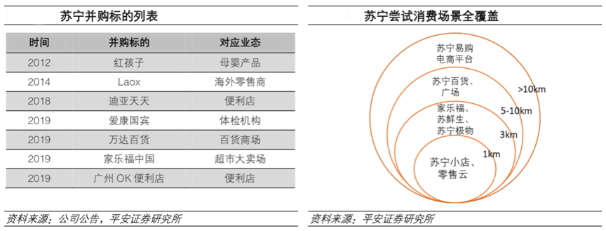 經(jīng)典案例:根據(jù)公司公告、平安證券研究所等綜合資訊表明,蘇寧線上平臺的商品品類從消費頻次低的家電3C,逐步向高頻消費的日 常百貨、食品飲料,乃至生鮮產(chǎn)品擴展。同時,蘇寧通過自建&并購,已在線下初步搭建起從社區(qū)周邊(1km),到日常生活圈(3km),再到一站式商業(yè)中心(5-10km)的消費場景體系,嘗試覆蓋消費者所有線下需求,以持續(xù)提升銷售規(guī)模。