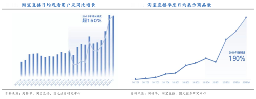 直播電商驅(qū)動下的銷售場景下,用戶的決策速度非??欤辈ゼ磧?nèi)容,內(nèi)容即交易,交易即分享,“產(chǎn)品——銷售——消費”的轉(zhuǎn)化鏈路極短,“種草——拔草”迅捷完成,主播的產(chǎn)品特色講解激發(fā)用戶消費興趣,特價活動引發(fā)用戶下單欲望,分享更可再優(yōu)惠。根據(jù)淘榜單、淘寶直播和國元證券研究中心等綜合資訊表明, 2019年末淘寶直播每天可購買商品數(shù)量同比增長 190%,覆蓋淘寶天貓的絕大部分品類,其中女裝、美妝、母嬰、食品為最熱門的品類。截至 2019 年末,消費者每天可觀看的直播內(nèi)容時長超 35 萬小時,直場景也由直播間擴展至工廠、田間、檔口、商場、街頭、市場等。