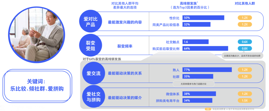 據(jù)騰訊、BCG《2020中國社交零售白皮書》調(diào)查數(shù)據(jù)表明,64%的高線銀發(fā)族會主動裂變,且活躍程度不亞于年輕人。與同類產(chǎn)品的對比、性價比內(nèi)容最能激發(fā)其興趣;剖析64%的裂變?nèi)巳海湟蕾嚺c熟人交流、鐘愛社群,并且喜歡在拼購類社交電商湊熱鬧、找實惠。