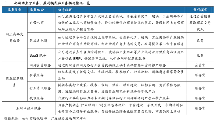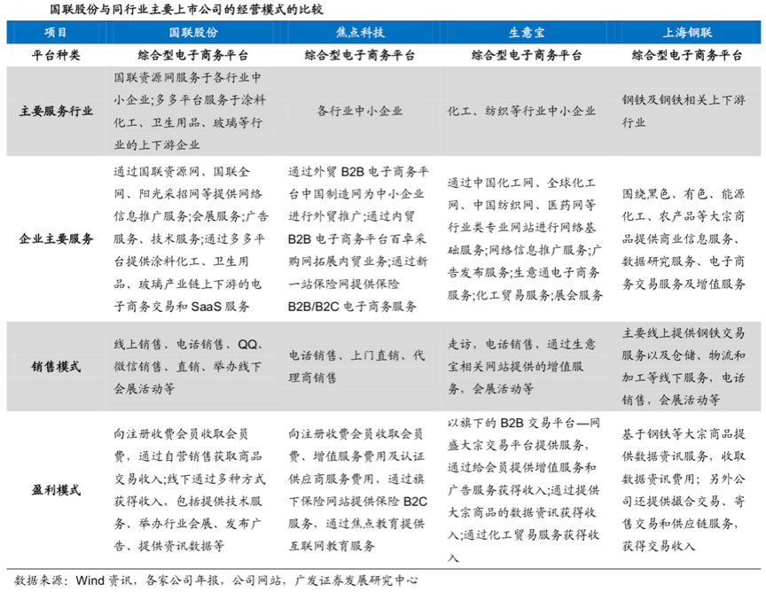 根據(jù)wind資訊、各家公司年報(bào)、公司網(wǎng)站、廣發(fā)證券發(fā)展研究中心等綜合資訊表明,以國(guó)聯(lián)股份為代表的產(chǎn)業(yè)互聯(lián)網(wǎng)平臺(tái),其經(jīng)營(yíng)模式大體相似,依靠產(chǎn)業(yè)資訊、交易資訊等吸引流量,以資訊服務(wù)、電商交易、交易服務(wù)、會(huì)員服務(wù)等多元化業(yè)務(wù)模式盈利,其盈利模式多以會(huì)員服務(wù)費(fèi)、自營(yíng)電商抽傭、營(yíng)銷(xiāo)推廣、會(huì)員增值服務(wù)等為主。產(chǎn)業(yè)互聯(lián)網(wǎng)代表著國(guó)內(nèi)智能制造及智能交易的潮流方向,亟待革新進(jìn)化。