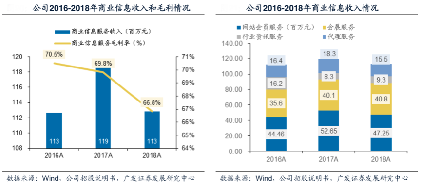 同時(shí)根據(jù)wind、公司招股說(shuō)明書(shū)、廣發(fā)證券發(fā)展研究中心等綜合資訊表明,國(guó)聯(lián)股份的商業(yè)信息收入當(dāng)中占比最大的主要是網(wǎng)站會(huì)員服務(wù),2018年的收入約為4725萬(wàn)元左右,會(huì)展服務(wù)收入收入增長(zhǎng)保持穩(wěn)定;行業(yè)資訊服務(wù)收入和代理服務(wù)下降顯著。