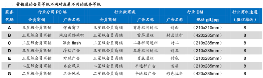 經(jīng)典案例:根據(jù)公司招股說(shuō)明書(shū)、廣發(fā)證券發(fā)展研究中心等綜合資訊表明,國(guó)聯(lián)股份依托于國(guó)聯(lián)資源網(wǎng)及各行業(yè)分網(wǎng)、行業(yè)DM網(wǎng)刊、微信公眾號(hào)、EDM電子郵件、鏈商活動(dòng),推出了跨平臺(tái)一站式立體營(yíng)銷(xiāo)推廣解決方案營(yíng)銷(xiāo)通,為會(huì)員提供線上線下的整合商機(jī)服務(wù),具體包括國(guó)聯(lián)資源網(wǎng)和各行業(yè)分網(wǎng)的供求商機(jī)撮合、企業(yè)商鋪展示推介、在線交易咨詢、行業(yè)和市場(chǎng)信息瀏覽服務(wù),國(guó)聯(lián)資源網(wǎng)和各行業(yè)分網(wǎng)的移動(dòng)平臺(tái)的展示、發(fā)布、推廣服務(wù),EDM的推廣服務(wù),DM紙媒的推廣服務(wù),微信公眾號(hào)的推廣服務(wù)等。營(yíng)銷(xiāo)通會(huì)員分為不同的等級(jí),等級(jí)不同所享受的服務(wù)不同。