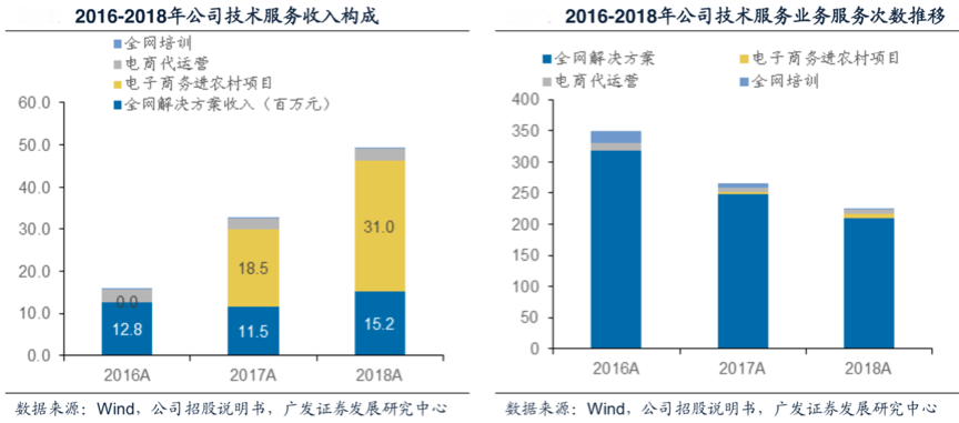 經(jīng)典案例:根據(jù)公司招股說(shuō)明書(shū)、廣發(fā)證券發(fā)展研究中心等綜合資訊表明,國(guó)聯(lián)股份的全網(wǎng)培訓(xùn)、電商代運(yùn)營(yíng)收入基本穩(wěn)定;電子商務(wù)進(jìn)農(nóng)村項(xiàng)目實(shí)施以來(lái),收入逐年上漲,2017年為1850萬(wàn)元,2018年增加67.57%達(dá)3100萬(wàn)元;全網(wǎng)解決方案收入波動(dòng),大致呈上漲趨勢(shì),2018年較2016年增加15.79%至 1520萬(wàn)元。各類技術(shù)服務(wù)次數(shù)除電子商務(wù)進(jìn)農(nóng)村項(xiàng)目外均減少,其中全網(wǎng)解決方案次數(shù)減少極為顯著,各類服務(wù)單價(jià)呈上升趨勢(shì)。